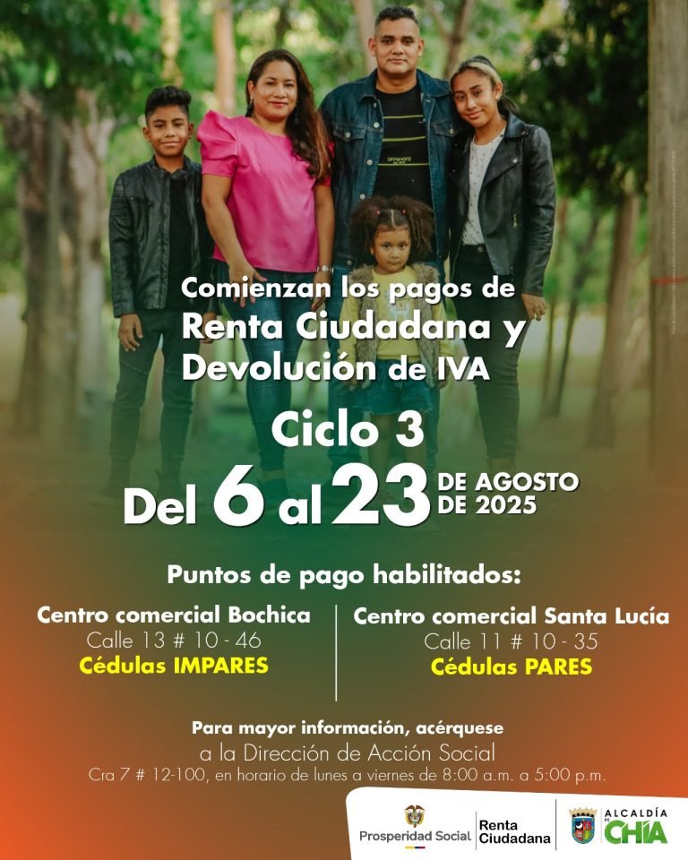 Beneficiarios de «Renta Ciudadana» y «Devolución del Iva» ya pueden reclamar su pago La Alcaldía de Chía, la Secretaría de Desarrollo Social y la Dirección de Acción Social informan que, a partir del 6 hasta el 23 de agosto de 2025, los beneficiarios de los programas “Renta Ciudadana y Devolución del IVA”, podrán reclamar el pago correspondiente al ciclo tres. ¿Qué es “Renta Ciudadana”? Según el Departamento de Prosperidad Social, “Renta Ciudadana es un programa que busca contribuir a la superación de la pobreza, fomentar la movilidad social y fortalecer la economía local, mediante la entrega de ayudas económicas, conocidas como Transferencias Monetarias Condicionadas y No Condicionadas. El programa comenzó en 2024 y se implementa de manera gradual y progresiva a través de diversas líneas de intervención. Actualmente, está en ejecución la línea de intervención Valoración del Cuidado”. (Prosperidad Social, s.f.). Ver Más